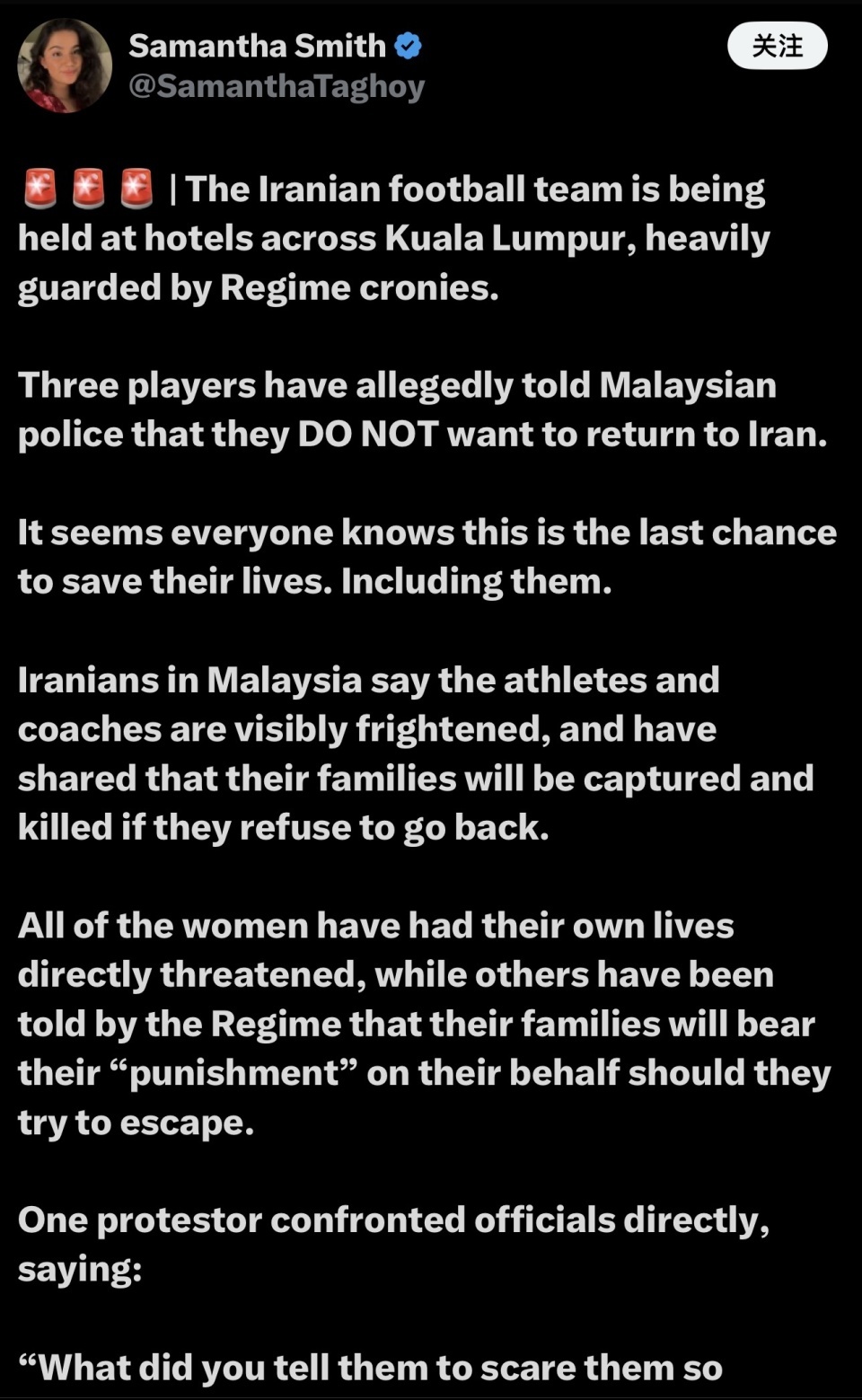 萨曼莎-史密斯是《每日邮报》专栏作家、天空电视台、BBC和ITV的评论员,根据她的最新报道,伊朗女足目前被“关押”在吉隆坡的酒店里,由伊朗政府的亲信严密看守。