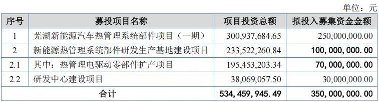 为进一步夯实产能基础、提升技术研发实力,把握行业发展机遇,朗信电气本次 IPO 拟募集资金3.5亿元,主要投向芜湖新能源汽车热管理系统部件项目(一期)和新能源热管理系统部件研发生产基地建设项目。